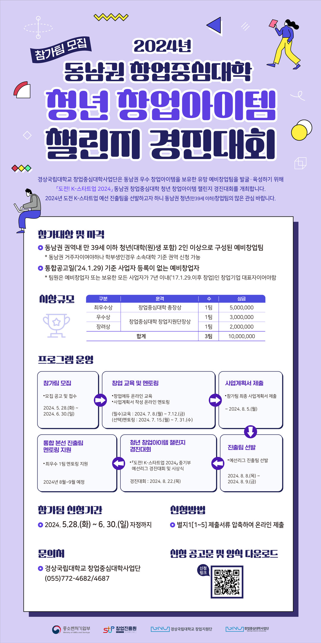 이번 창업경진대회는 중소벤처기업부, 창업진흥원, 경상국립대 창업중심대학사업단이 주최·주관하여 부처 통합 경진대회인 ‘도전! K-스타트업 2024’ 본선 진출팀을 선발하기 위한 예선리그로 7-8월에 진행된다.