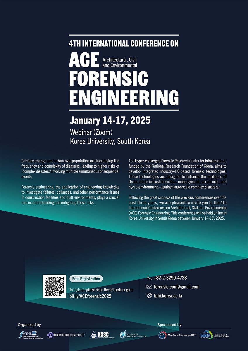 행사 무료 참가 신청은 QR코드 접속 또는 bit.ly/ACEforensic2025에서 가능하며, 초융합 건설 포렌식 연구센터 홈페이지(fphi.korea.ac.kr)에서 일자별 프로그램 등 더 자세한 내용을 확인할 수 있다.