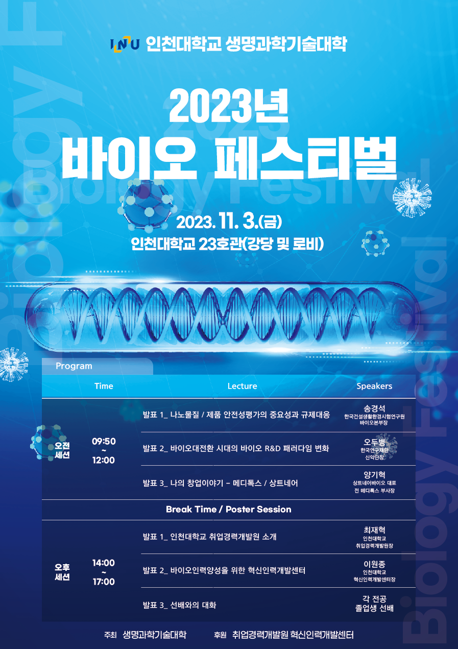 오후 세션에서는 최재혁 인천대 취업경력개발원장과 이원종 혁신인력개발센터장이 취업경력개발원 사업과 바이오인력양성사업에 대한 소개를 진행하고, 사회에 진출한 선배들과의 대화 기회를 통해 학생들에게는 진로 탐색을 할 수 있는 시간을 마련한다.