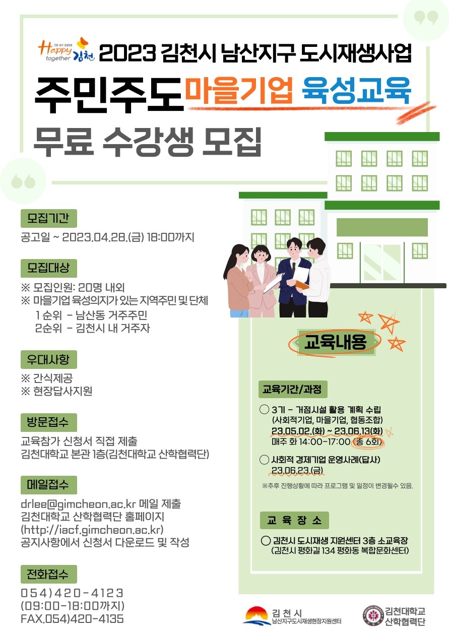 마을기업 육성을 위한 이번 교육은 5월부터 6주 과정으로 매주 1회 김천시 도시재생센터에서 진행된다.