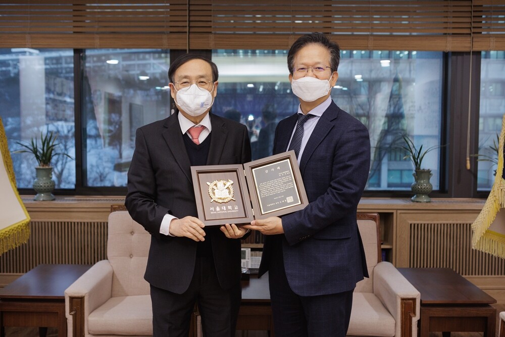 오세정(왼쪽) 서울대 총장이 치의학대학원 100주년 기념기금으로 10억원을 기부하기로 약정한 최규옥 오스템임플란트 회장에게 감사패을 전달한 뒤 기념촬영을 하고 있다. 사진=서울대 제공 |