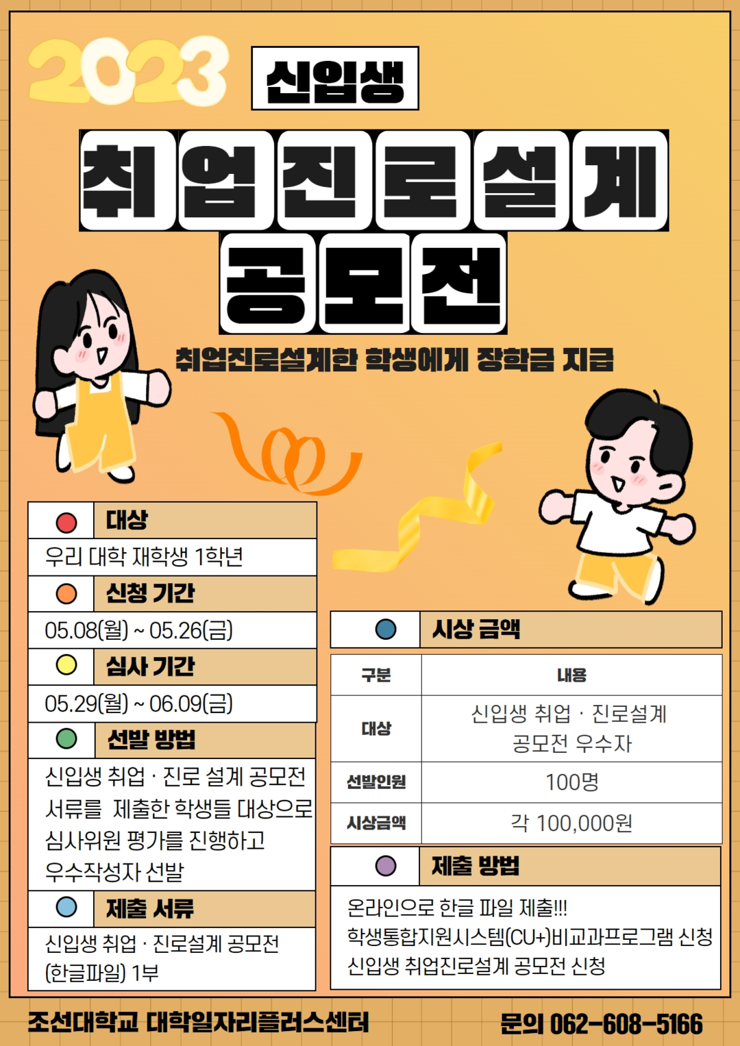 12일 조선대에 따르면 공모전은 직업정보탐색을 통해 조기 취업 취업진로설계와 2023 신직업을 알아보고 직업별 단기, 중기 계획을 세워 희망직업을 탐색할 수 있도록 마련했다.