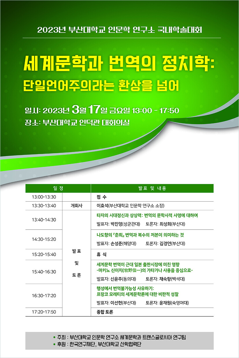 16일 부산대에 따르면 학술대회에는 부산대와 성균관대, 한국해양대, 동의대, 백석대, 숙명여대 등 국내 관련 분야 전문가들이 다수 참가해 세계문학과 번역이 개입할 때 나타나는 갈등과 긴장들을 살펴본다.