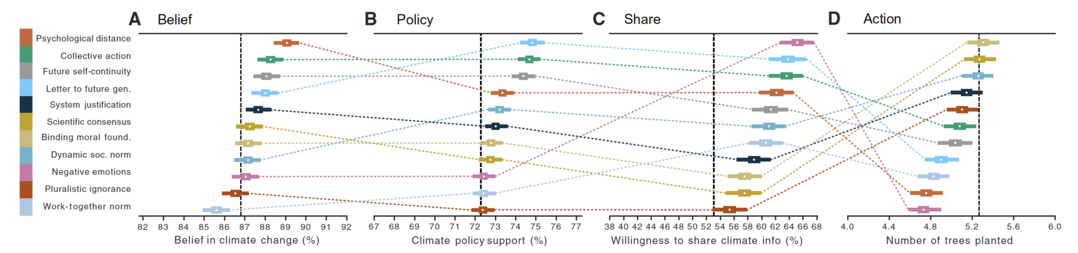 각 개입 메시지가 기후 위기에 대한 개인의 믿음 (belief), 대응 정책에 대한 지지정도 (policy), 정보를 공유하려는 동기 (share), 혹은 기후 변화 대응을 위한 개인 노력 (action)에 미치는 영향. |