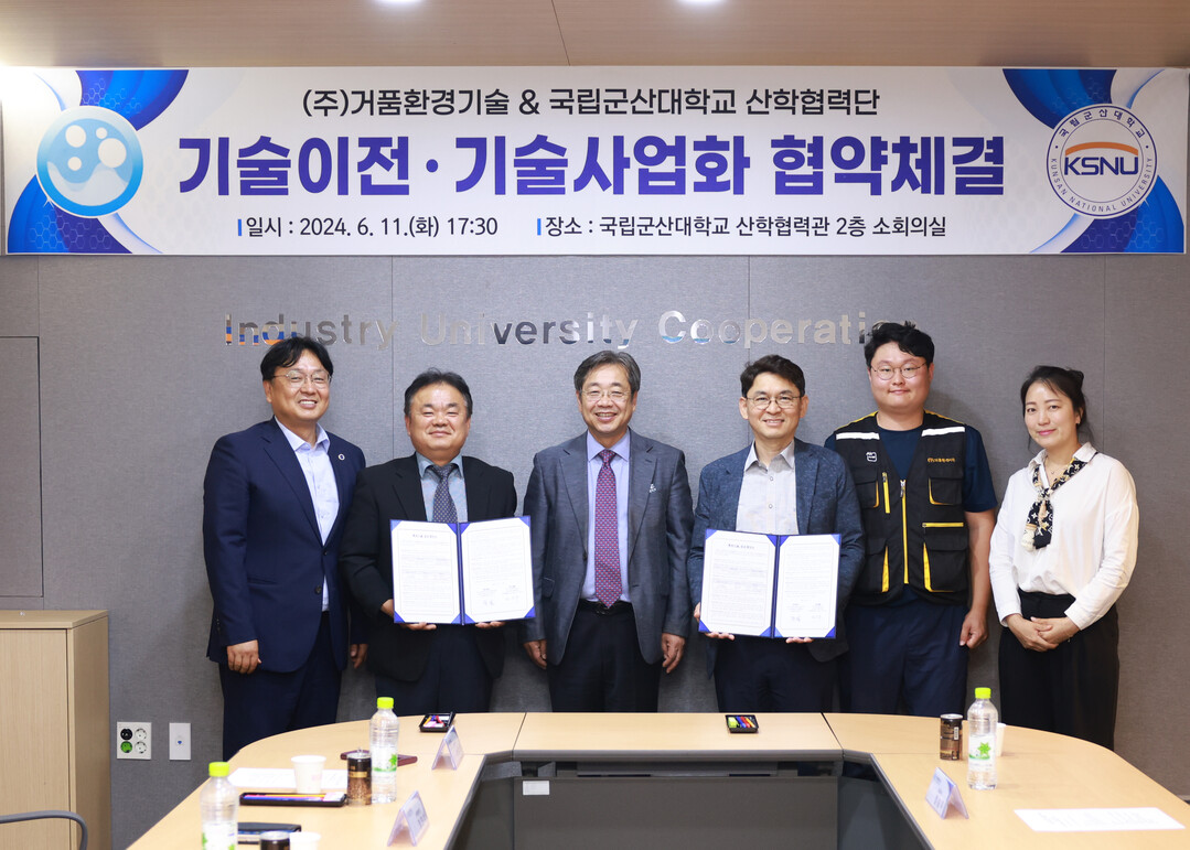 ㈜거품환경기술과 국립군산대학교는 11일 산학협력단 회의실에서 토양 오염 및 악취제거 핵심기술인 ‘계면활성제 거품을 이용한 회분식 오염토양 정화처리장치 기술이전 협약식’을 갖고 거품을 활용한 악취제거 및 토양오염 정화처리 개발을 확대하여 새로운 기술력을 확보하기로 했다.