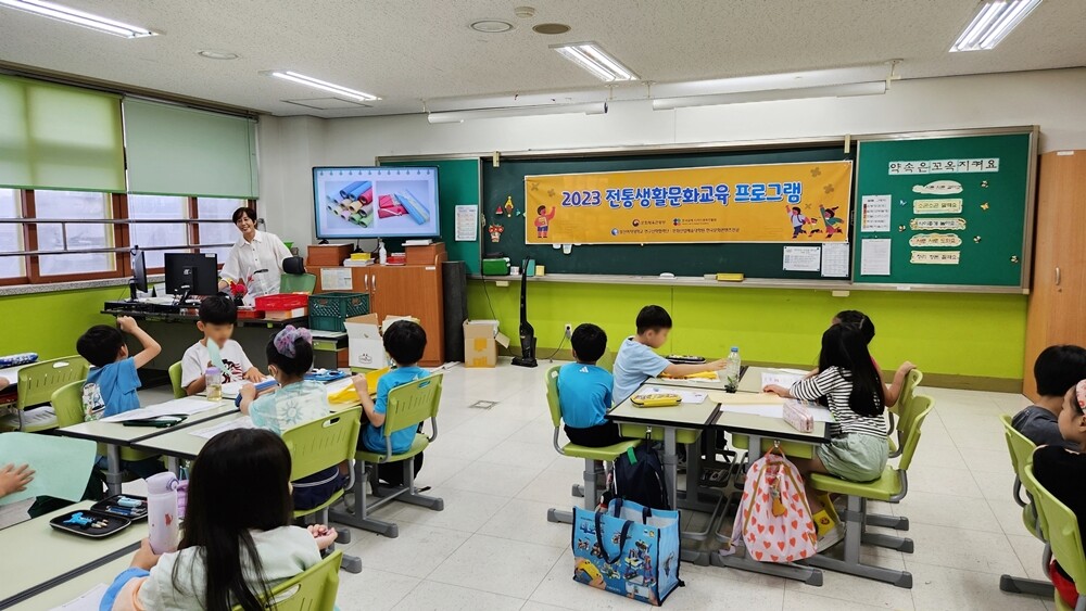 성신여대 문화산업예술대학원이 초등학교 저학년 대상으로 전통생활 문화교육 프로그램을 운영하는 모습. 사진=성신여대 제공 |