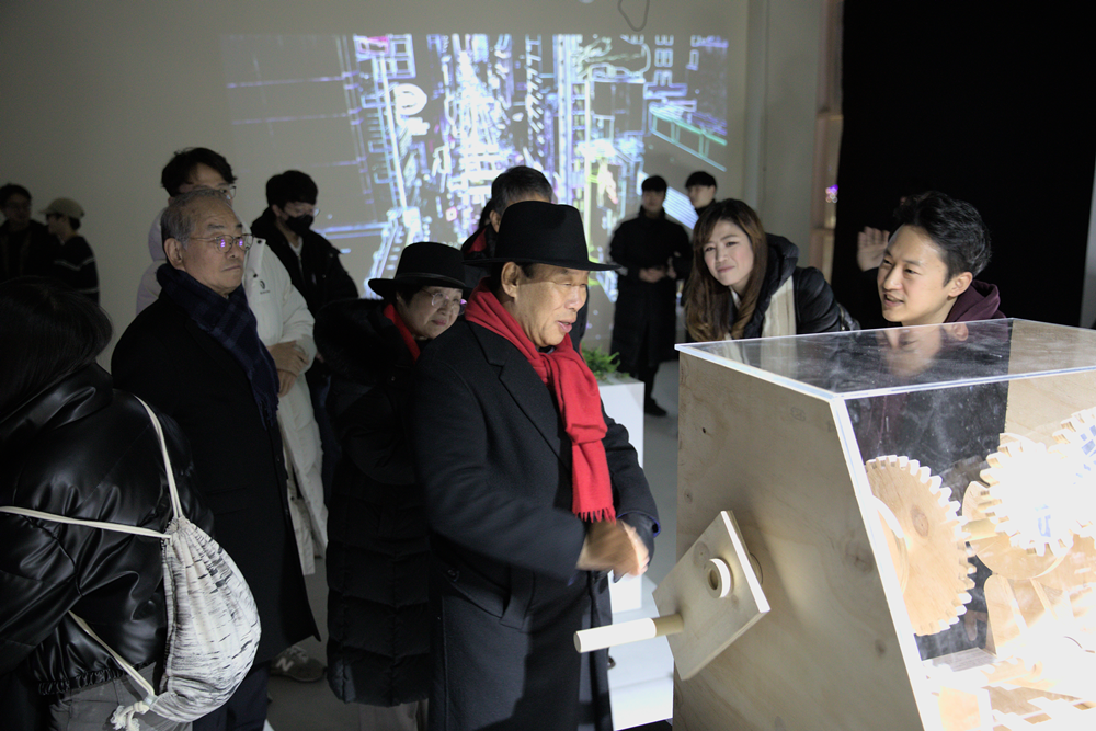 최민호 세종시장과 관계자들이 지난 2일 한국영상대 ‘백색소음-공명’ 전시회를 찾아 작품들을 감상하고 있다. 사진=한국영상대 제공 |