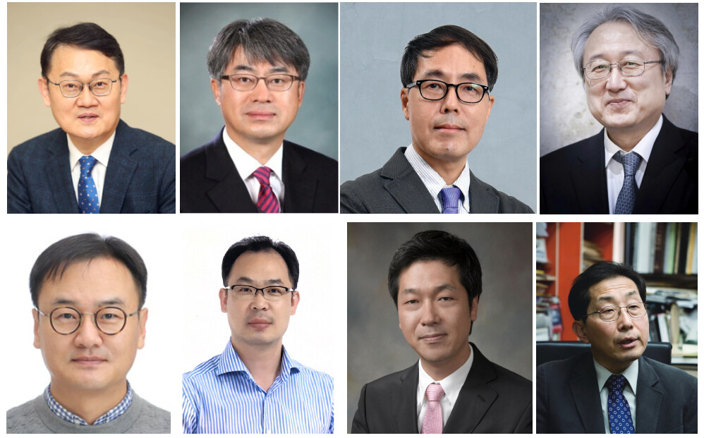 윗줄 왼쪽부터 이종화(경제학과), 김종승(화학과), 조민행(화학과), 이성환(인공지능학과) 교수, 아랫줄 왼쪽부터 박만성(의과학과), 강윤찬(신소재공학부), 곽상규(화공생명공학과) 교수, 심경호 명예교수(한문학과). |