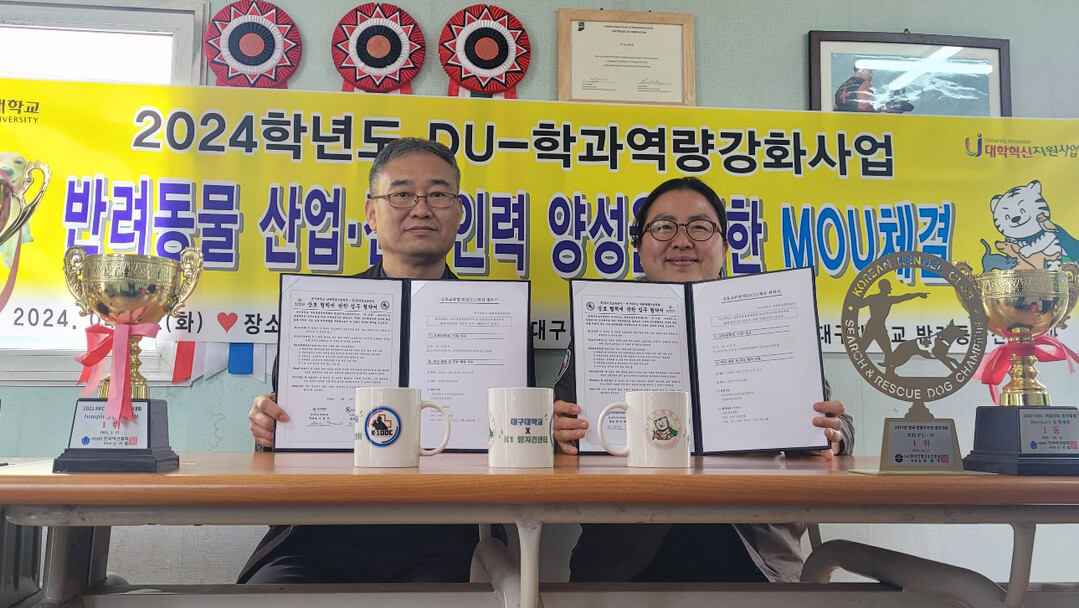 [대학저널 이선용 기자] 대구대학교 반려동물산업학과가 K1탐지견센터와 지난 4월 2일 K1탐지견센터 사무실에서 반려동물 산업 및 전문 인력 양성을 위한 상호 업무협약을 체결했다.