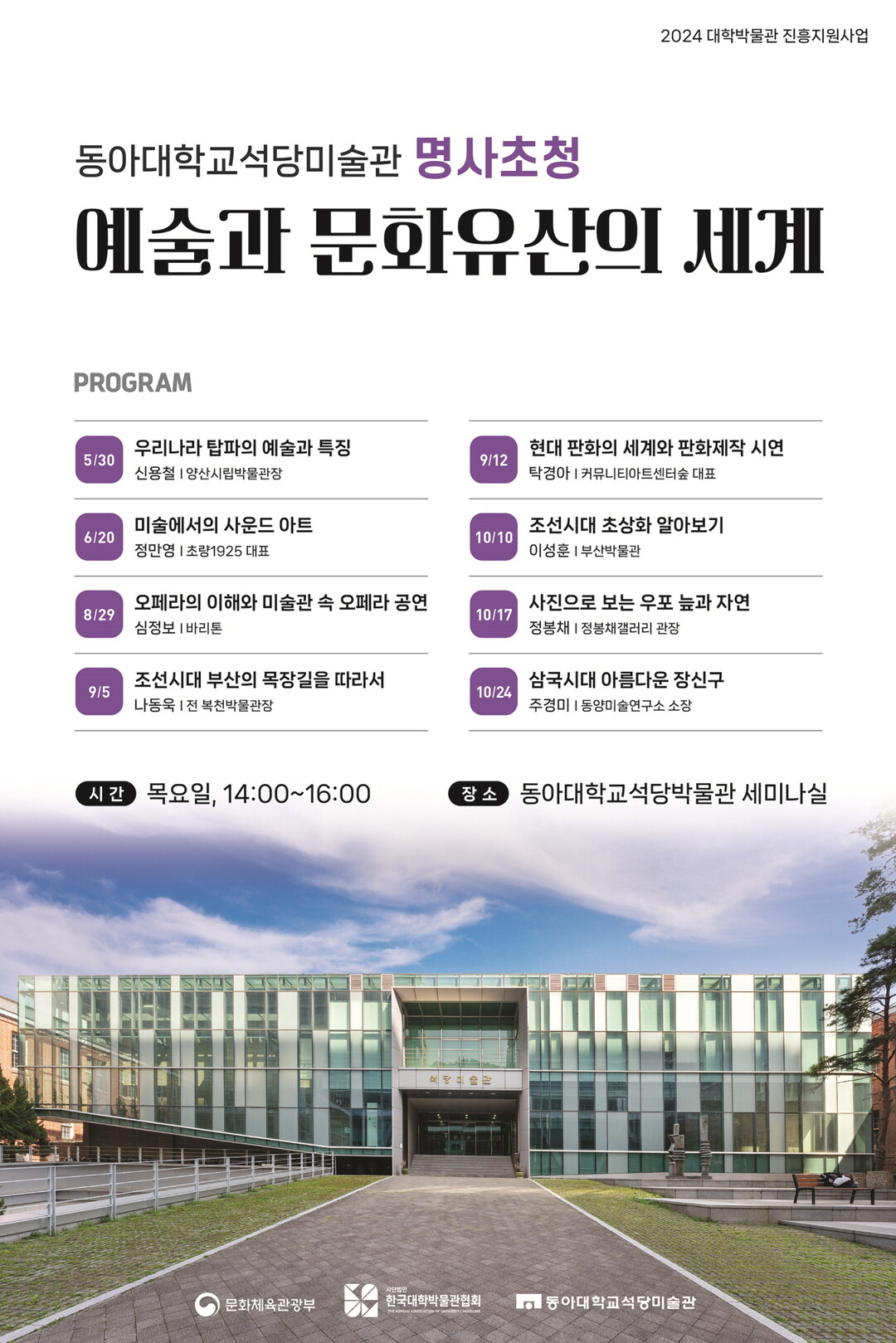 문화체육관광부 주최, 한국대학박물관협회 주관, 동아대학교 석당미술관 운영으로 진행되는 이번 강연 프로그램은 예술과 문화유산을 주제로 삼국시대부터 현대에 이르기까지 다양한 분야를 다룬다. 모두 8명의 명사를 초청, 특강 및 시연·체험·공연 등으로 이뤄진다.