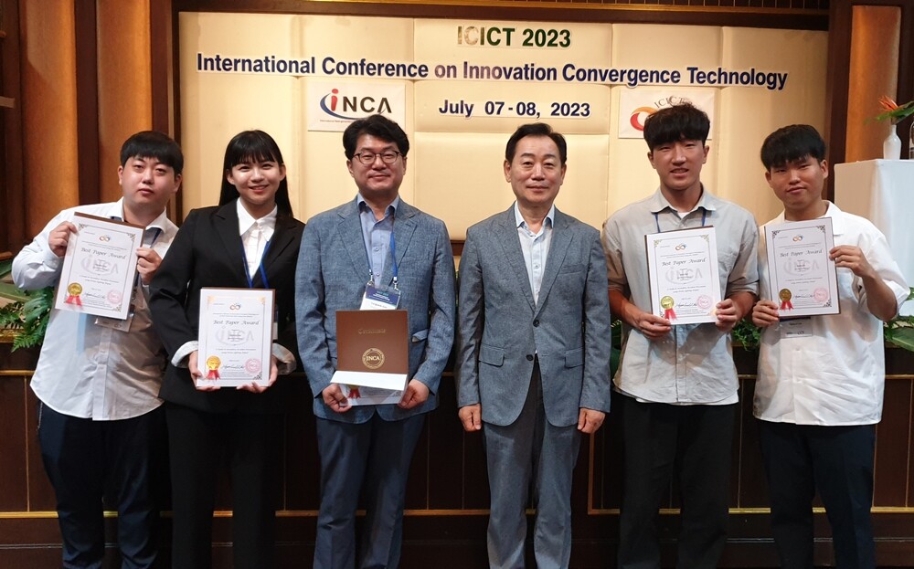 태국에서 열린 ‘2023 국제차세대융합기술학회 학술대회’에서 우수논문상을 수상한 신성대 학생들. 사진=신성대 제공 |