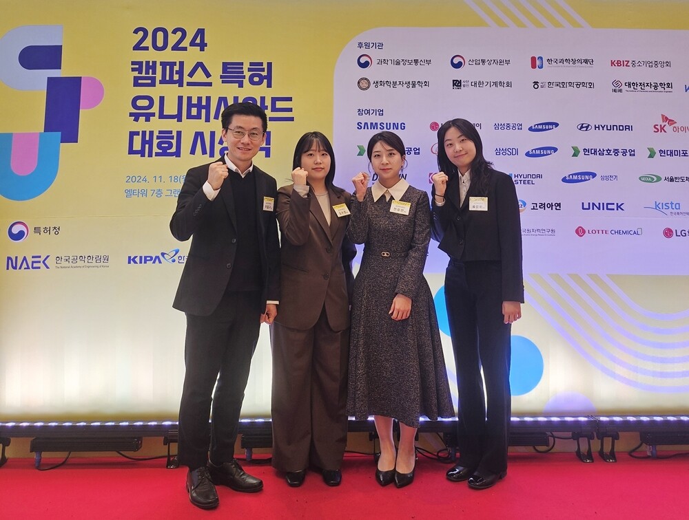 2024 캠퍼스특허유니버시아드에서 산업통상자원부장관상을 수상한 이일구 성신여대 미래융합기술공학과 연구팀이 기념사진을 촬영하고 있다. 왼쪽부터 이일구 교수, 김수경, 전유란, 류정화 연구원. 사진=성신여대 제공 |