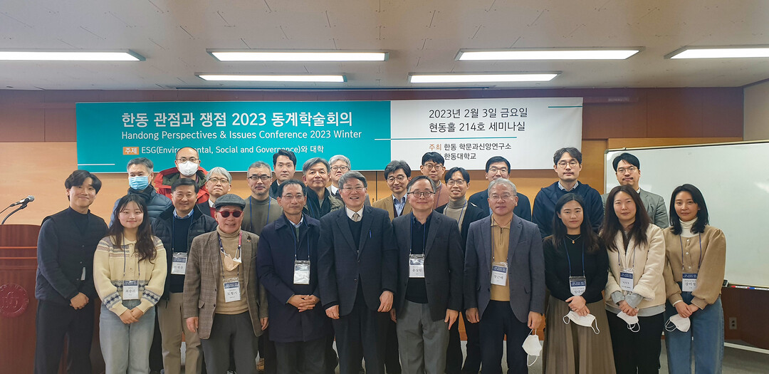 지난 3일 열린 한동대 ‘한동 관점과 쟁점 2023’ 동계 학술대회 참석자들이 기념촬영을 하고 있다. 사진=한동대 제공