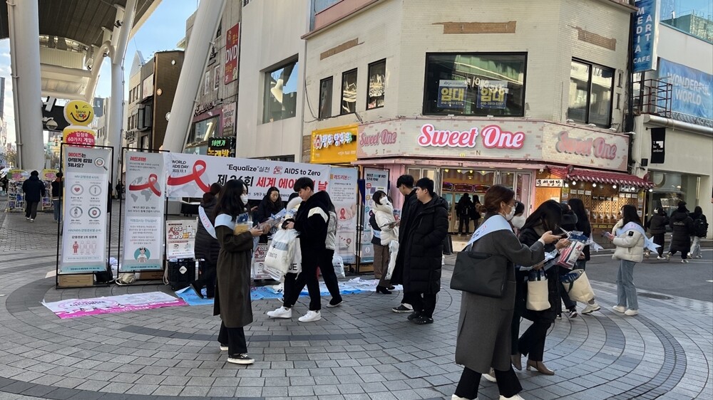 대전 은행동에서 1일 건양대 간호학과가 산학연 에이즈의 날 캠페인을 벌이는 모습. 사진=건양대 제공 |
