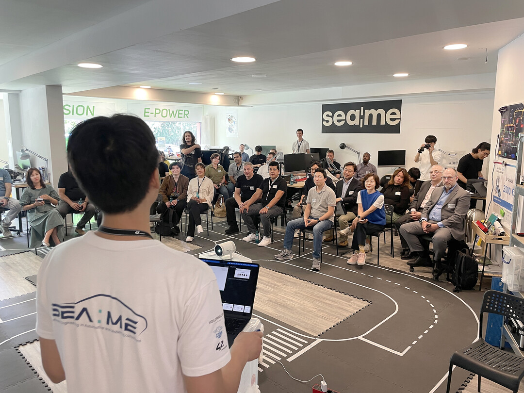 독일의 폭스바겐그룹코리아와 함께 추진하는 국민대 글로벌 교육 프로그램(sea:me) 에 참여한 학생이 프리젠테이션하고 있다. 사진=국민대 제공 |