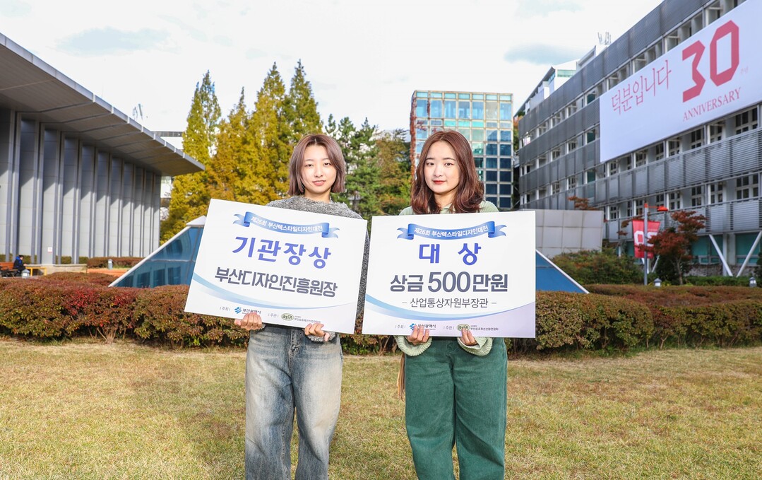 제26회 부산텍스타일디자인대전에서 대상을 수상한 동서대 김지영 학생(오른쪽)과 김시온 학생이 기념촬영하고 있다. 사진=동서대 제공 |