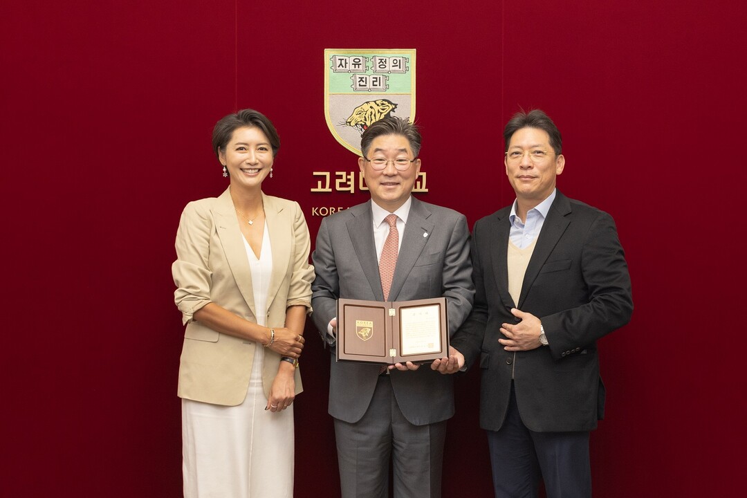 왼쪽부터 한성주 기부자, 김동원 고려대 총장, 한현철 기부자. 사진=고려대 제공 |