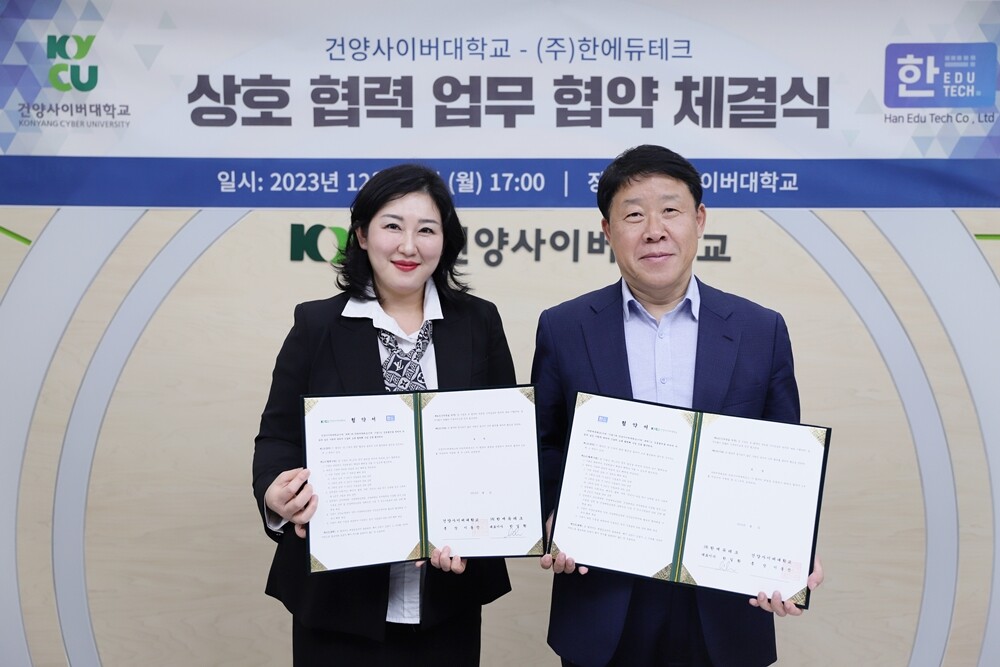 건양사이버대가 지난 11일 한에듀테크와 해외 학생을 위한 교육서비스 제공 MOU 협약을 체결했다. 왼쪽이 건양사이버대 이진경 입학홍보처장, 오른쪽이 한에듀테크 한일환 대표이다. 사진=건양사이버대 제공 |