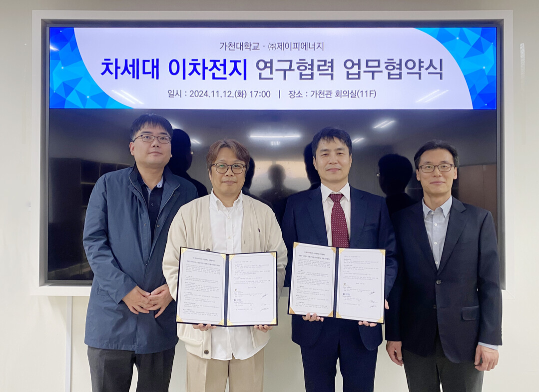 [대학저널 이선용 기자] 가천대학교 산학협력단과 제이피에너지가 12일 대학 가천관에서 이차전지 소재분야 기술개발과 전문인력 교류, 교육 관계 시설물 상호 활용 등을 위한 업무협약을 체결했다. 이날 협약식에는 가천대 송윤재 산학협력단장과 제이피에너지 박지훈 대표 등이 참석했다.