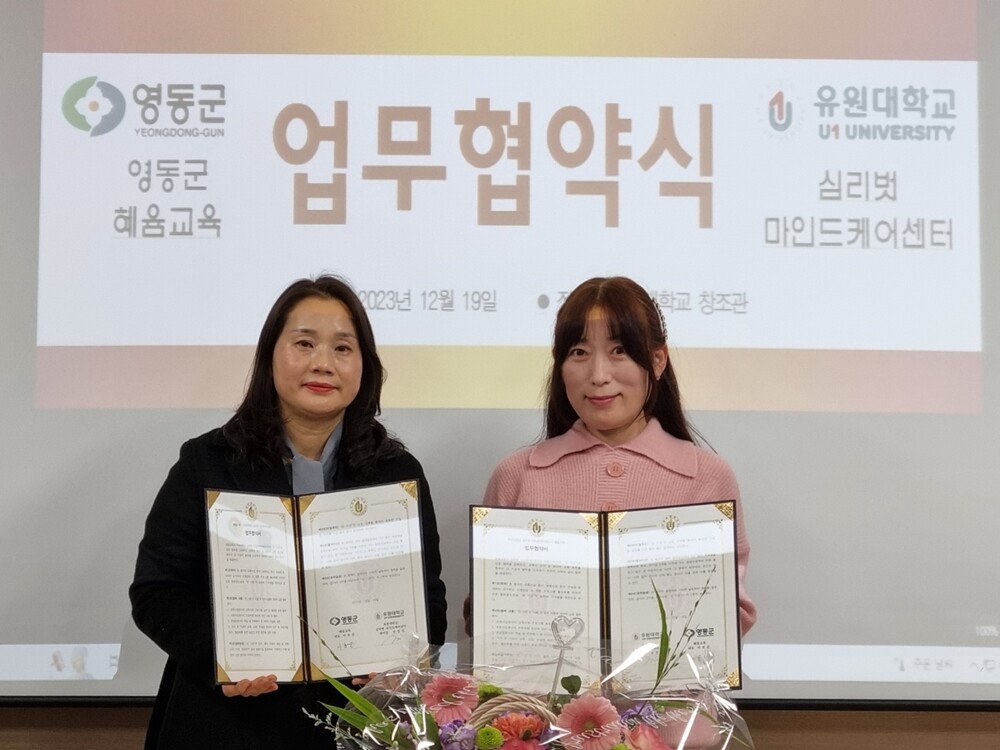 유원대 산학협력단 부설 심리벗 마인트케어센터가 19일 혜윰교육과 업무협약을 체결했다. 사진=유원대 제공 |