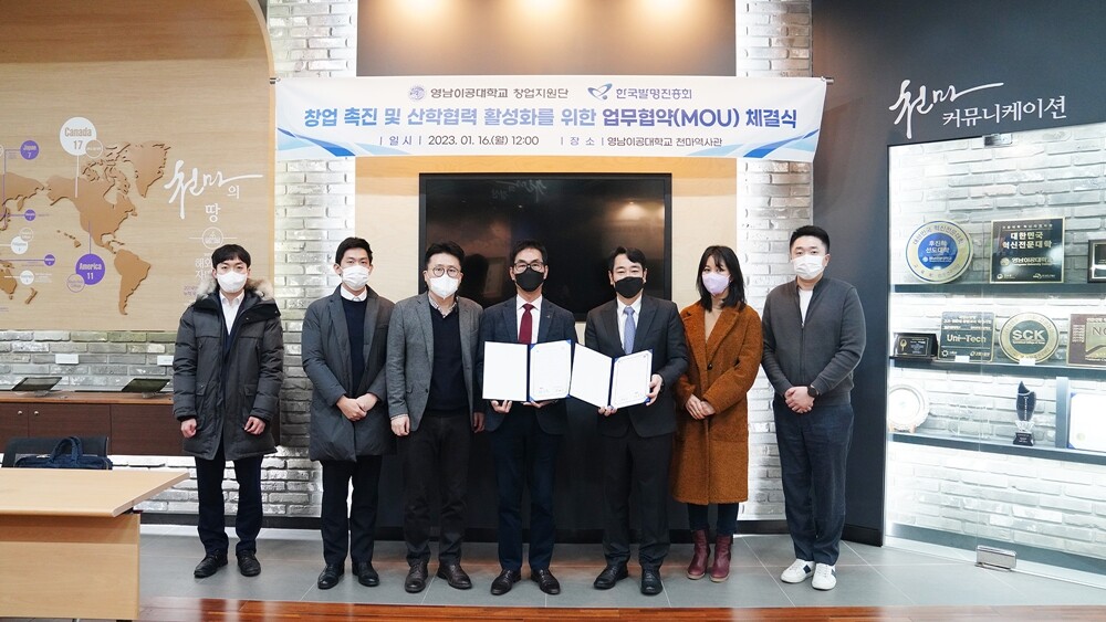 영남이공대 창업보육센터와 한국발명진흥회 관계자들이 지난 16일 창업 활성화를 위한 업무협약을 체결한 뒤 기념촬영하고 있다. 사진=영남이공대 제공 |