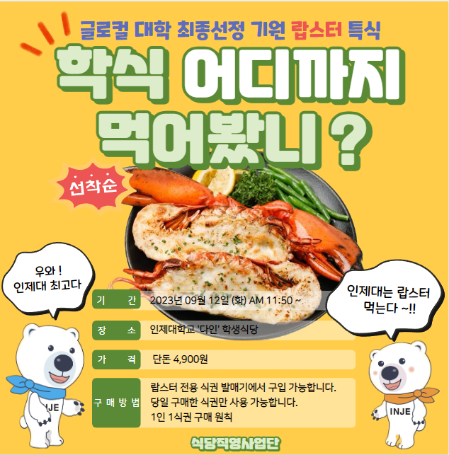 대학직영식당인 다인은 12일 정오부터 '랍스터 치즈구이 정식'을 300개 한정 4,900원에 학생들에게 판매한다.