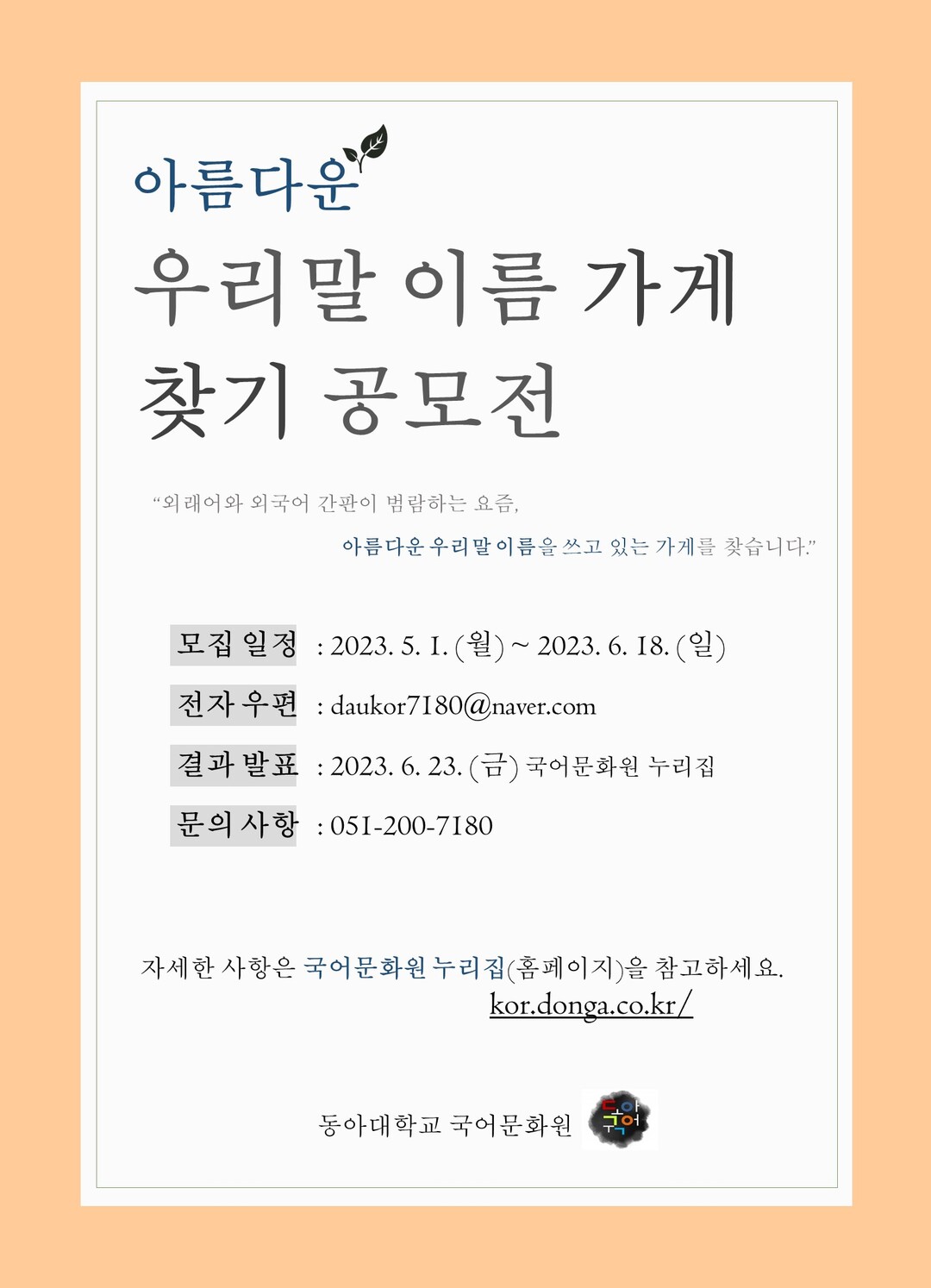 접수기간은 6월 18일까지며, 심사를 거쳐 같은 달 23일 동아대 국어문화원 누리집을 통해 결과를 발표한다.