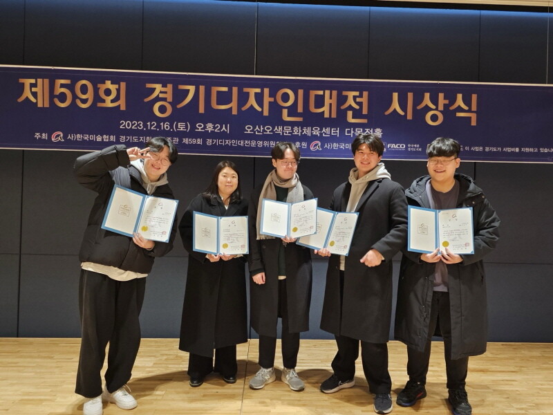 제59회 경기디자인대전에서 최우수상과 특별상을 수상한 경기과기대 학생들과 강재신 교수(왼쪽에서 두 번째 강재신). 사진=경기과기대 제공 |