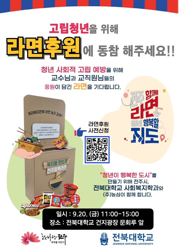 사회복지학과는 이날 오전 11시부터 오후 3시까지 라면 기부를 받으며, 오후 2시에는 ‘전주함께라면’ 협약식과 함께 고립 청년 지원을 위한 다양한 방안 등도 논의된다.