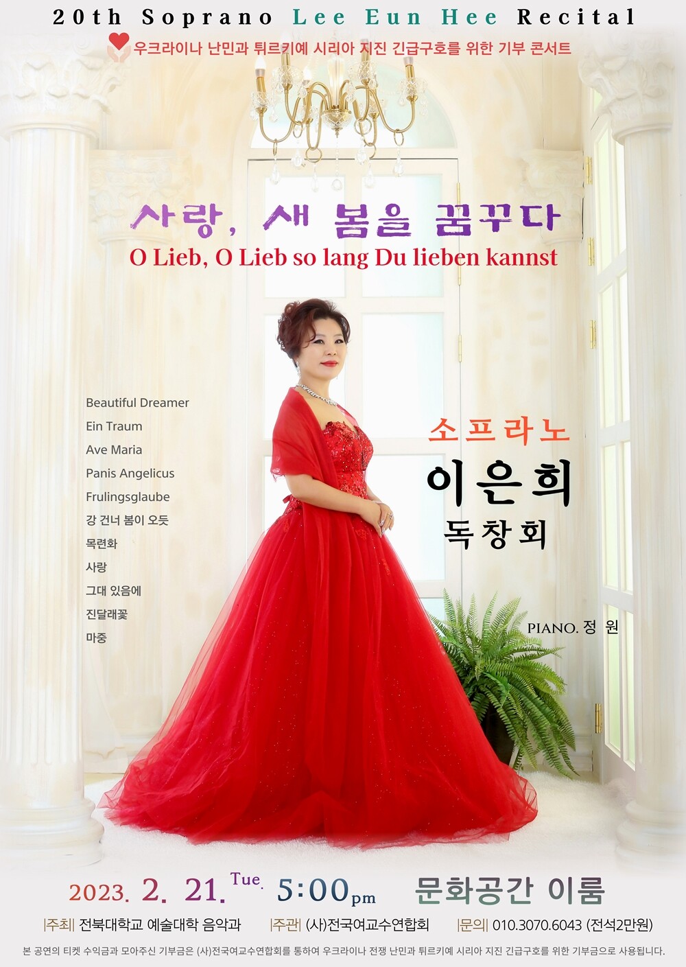 20일 전북대에 따르면 21일 전주 문화공간 이룸에서 열리는 독창회는 ‘사랑, 새 봄을 꿈꾸다’라는 주제로, 예정. 꿈과 기원, 새봄, 사랑, 삶 등의 각 주제별 음악을 통해 위로와 함께 새봄의 희망을 이야기한다.
