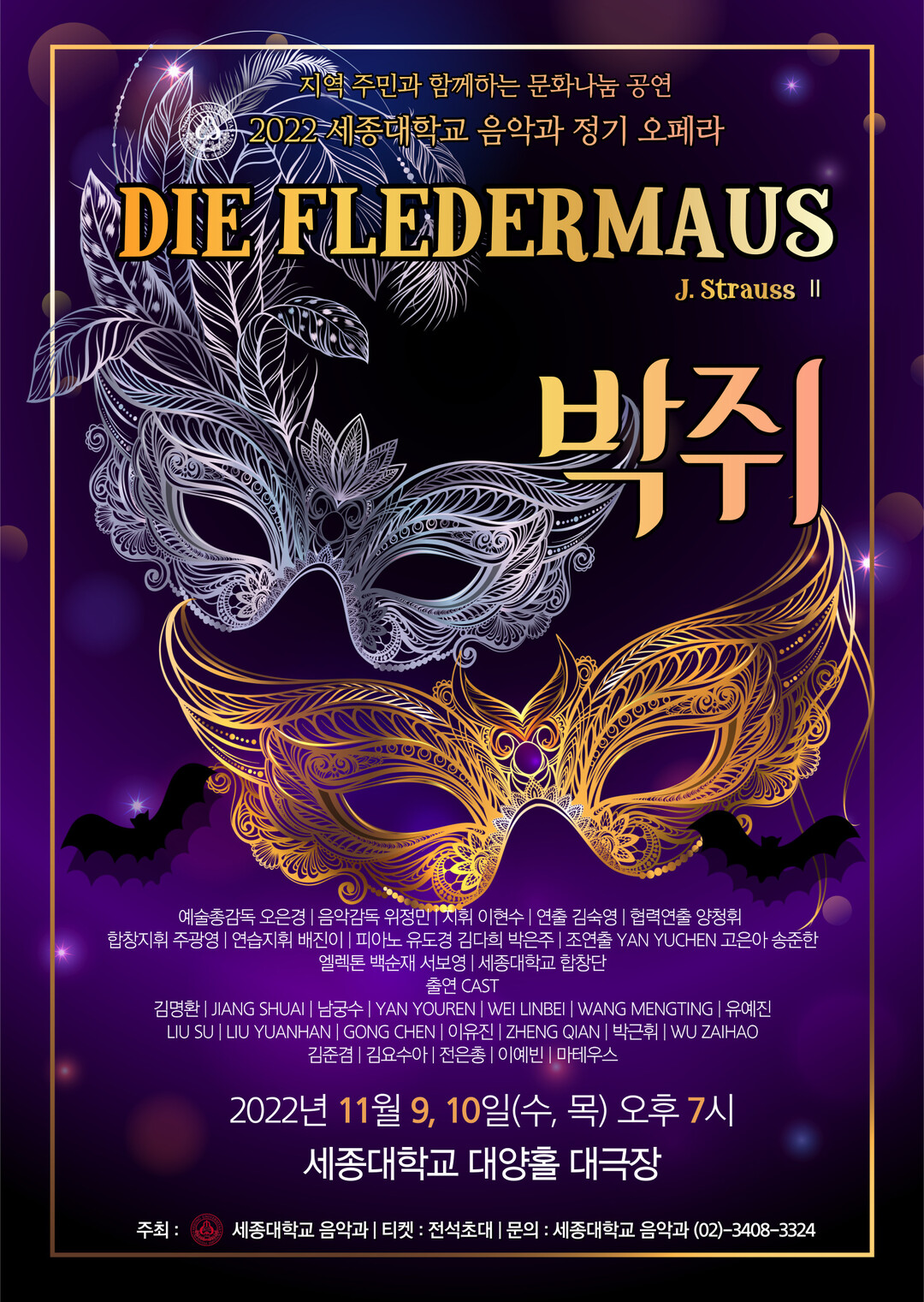 1일 세종대에 따르면 오페라 박쥐는 오은경 교수가 예술 총감독을, 위정민 교수가 음악감독을 각각 맡는다. 지휘는 이현수 교수, 연출은 김숙영 교수가 맡았다.