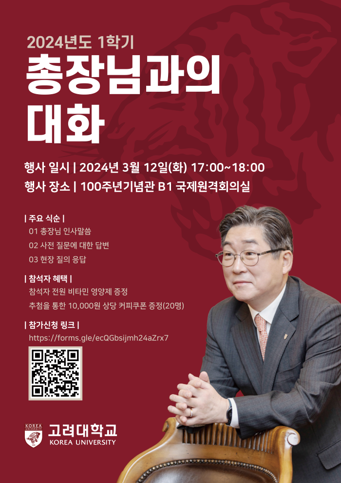 [대학저널 이선용 기자] 김동원 고려대 총장이 학생들과의 소통을 위해 3월 12일 오후 5시 고려대 백주년기념관 국제원격회의실에서 ‘총장님과의 대화’ 행사를 진행한다.