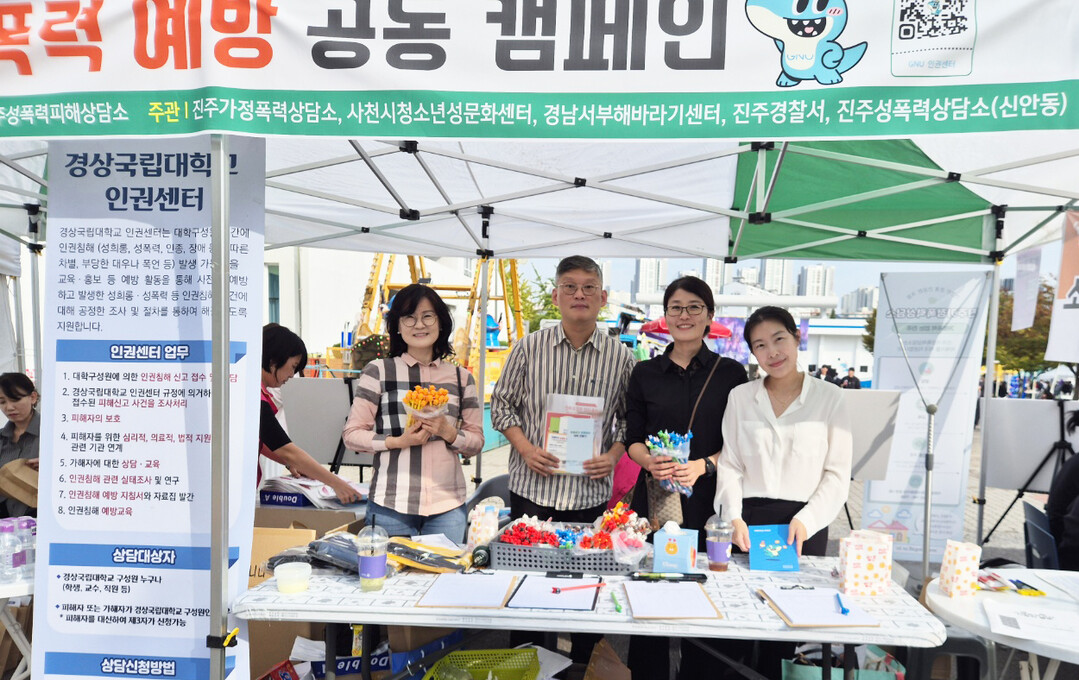 [대학저널 이선용 기자] 경상국립대학교 인권센터는 10월 16일 가좌캠퍼스에서 사단법인 진주성폭력피해상담소와 공동으로 ‘2024년 하반기 젠더폭력 예방 캠페인’을 개최했다고 17일 밝혔다.