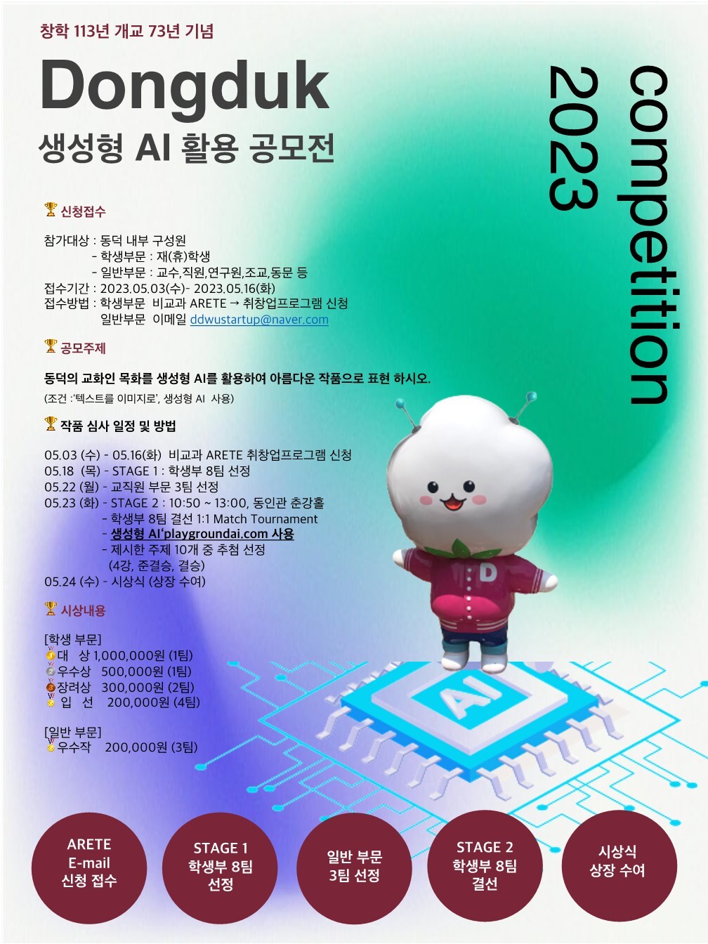 공모전 학생 작품은 학생회가 직접 심사하여 8팀을 선발하고, 1대1 토너먼트 형태의 재미와 기량을 겨루는 결선을 통해 학생부 대상(1팀) 우수상(1팀) 장려상(2팀) 입선(4팀)을 선정할 예정이다.