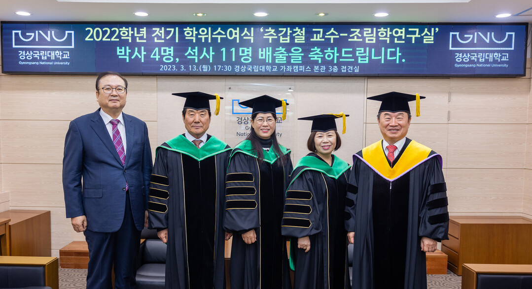[대학저널 김소현 기자] 경상국립대학교 조림학연구실이 지난 2월 24일 박사 4명, 석사 11명을 한꺼번에 배출했다. 특히 그중 1명인 김정수 박사는 올해 72살 만학도여서 더욱 눈길을 끈다.