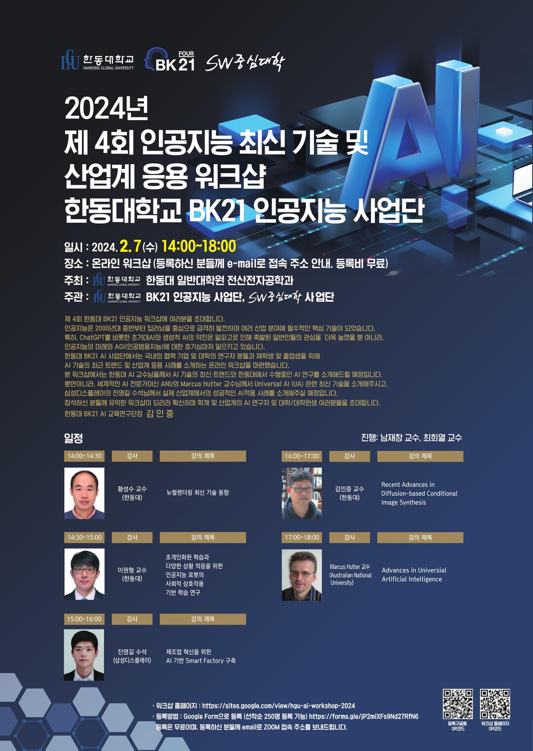 이번 워크숍에는 김인중 한동대 BK21 AI교육연구단장과 황성수 한동대 교수가 최근 관심이 높아진 생성적 AI모델과 딥러닝 기반 렌더링 기술의 최근 트랜드를 소개하고, 이원형 한동대 교수가 사회적 상호작용을 통한 인공지능 로봇의 주도적 학습 방법을 설명한다. 뿐만 아니라 유명 AI전문가인 호주국립대(ANU) Marcus Hutter 교수가 유니버셜 인공지능(Universal AI)에 대해 강의하고, 삼성디스플레이 진영길 수석이 스마트 팩토리 분야에서 성공적인 AI 적용사례들을 소개한다.