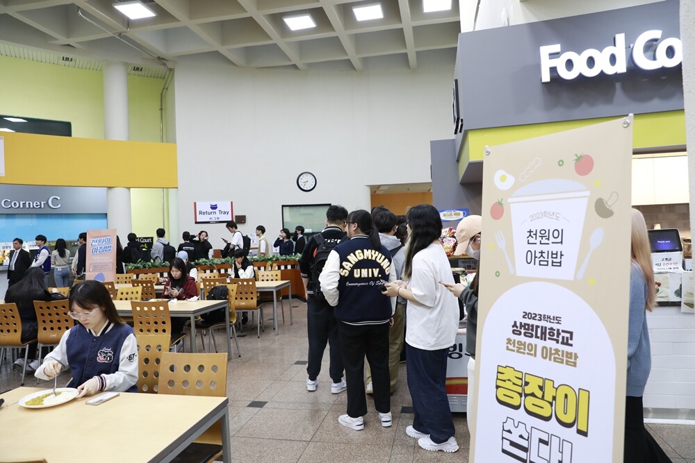 [대학저널 온종림 기자] 상명대학교 홍성태 총장이 3일 천안캠퍼스 학생식당에서 ‘천원의 아침밥’ 사업 선정을 기념해 아침밥 무료 이벤트 ‘총장이 쏜다’를 진행했다.