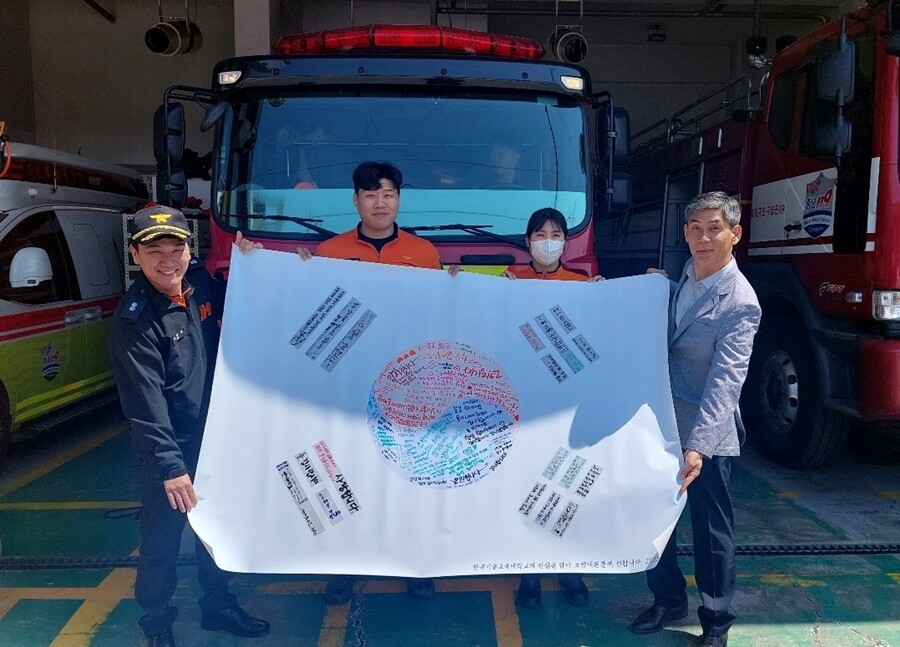 한기대는 학생들이 직접 작성한 소방대원 응원 메시지가 담긴 태극기를 지난 4월 29일 관할 소방서인 천안시 동남구 병천119안전센터에 전달했다.