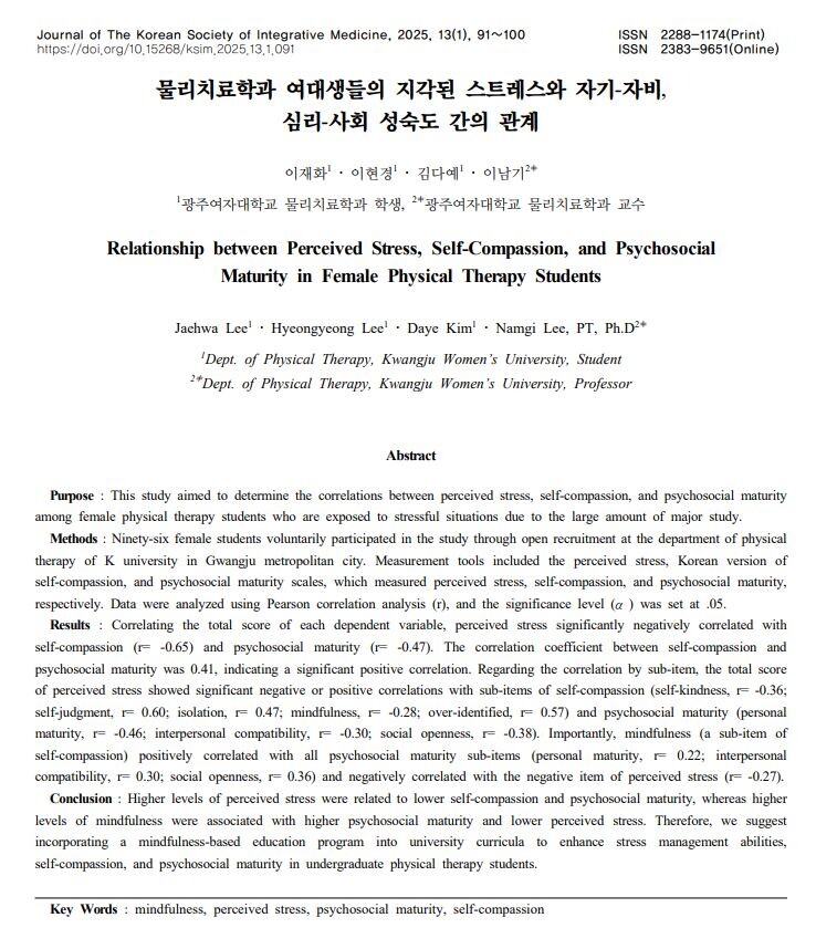 또한 김다예 학생(공동저자)은 “논문을 작성하며 학문적 성장과 문제해결능력을 기르는 소중한 경험이 되었다. 이 연구를 통해 물리치료학과 여대생들의 스트레스가 다른 심리적 요인과 밀접하게 연결되어 있음을 알게 되었다”고 소감을 밝혔다.