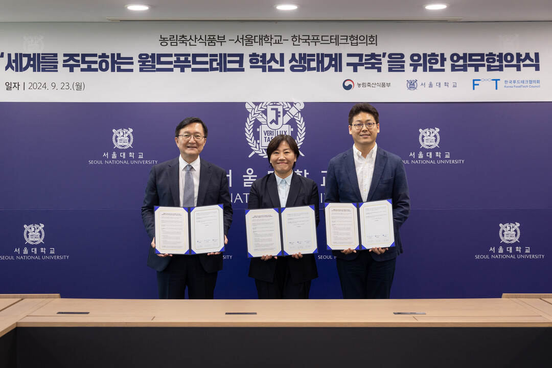 [대학저널 이선용 기자] 서울대학교는 9월 23일 관악캠퍼스 행정관 대회의실에서 농림축산식품부 및 한국푸드테크협의회와 함께 한국 푸드테크 산업의 세계 주도를 위한 3자 간 업무협약을 체결했다고 25일 밝혔다.