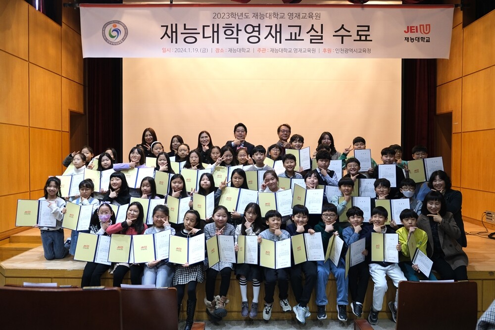 인천광역시교육청이 후원하는 재능대학영재교실은 초등 2‧3학년을 대상으로 2년간 매주 주말마다 실시하는 교육 프로그램으로 수학과 과학 등 다양한 학습‧체험활동으로 이루어져 있다. 이번 수료식에는 초등 3학년 49명에게 수료증이 수여됐다.