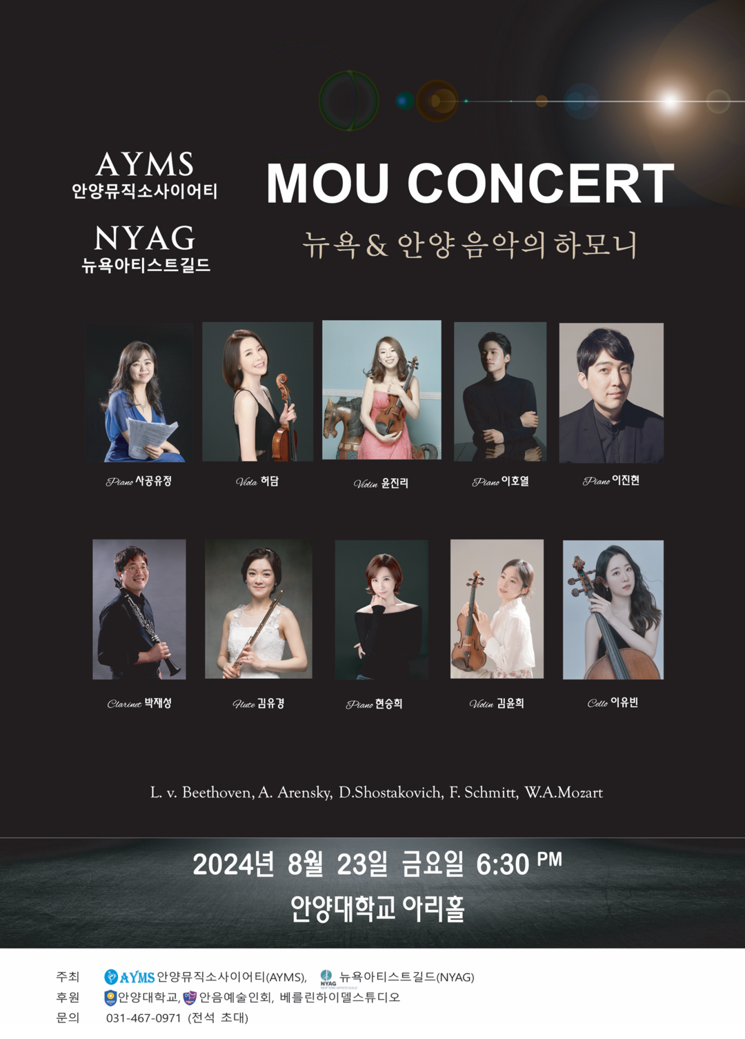 이어 양 기관의 업무협약 체결을 기념해 열리는 MOU 기념 콘서트는 안양뮤직소사이어티의 피아노 사공유정, 이호열, 이진현, 현승희, 클라리넷 박재성, 플루트 김유경, 바이올린 김윤희, 첼로 이유빈과 뉴욕아티스트길드의 비올라 허담, 바이올린 윤진리 등이 L. V. 베토벤, A. 아렌스키, D. 쇼스타코비치, F.슈미트, W.A. 모차르트 등 트리오 곡으로 아름다운 음악의 하모니를 선사할 예정이다.