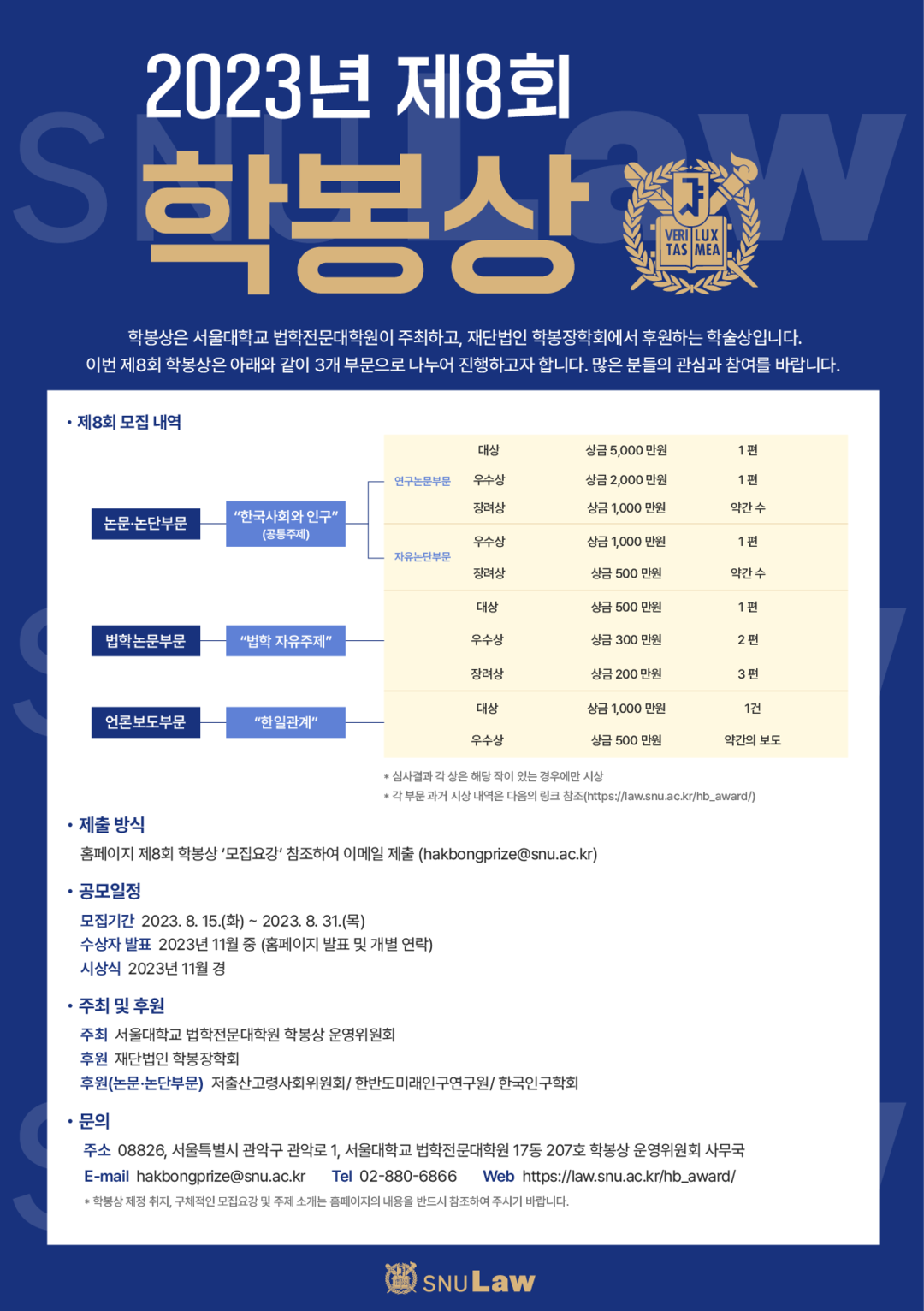 올해에는 기존 연구논문부문을 논문·논단부문으로 새롭게 개편하고, 각각 연구논문부문과 자유논단부문으로 나누어 모집하며, 법학전문대학원 학생들을 대상으로 한 법학논문 부문과 언론보도 시상을 위한 언론보도부문을 함께 모집할 예정이다.