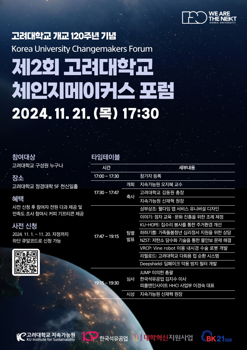 본 행사에서는 2024학년도 1학기 동안 교내에 의미 있는 변화를 이끈 8팀도 참여한다. 상부상조팀 ‘웰다잉 앱 서비스 유니버설 디자인’, 이야기팀 ‘점자 교육·문화 진흥을 위한 조례 제정’, KU-HOPE팀 ‘집수리 봉사를 통한 주거환경 개선’, 하하기쁨팀(대학원) ‘가족 돌봄청년 심리 정서 지원을 위한 상담’, NZST팀(대학원) ‘저탄소 담수화 기술을 통한 물 안보 문제 해결’, VRCP팀 ‘Vine robot 이용 내시경 수술 로봇 개발’, 리필로드팀 ‘고려대학교 다회용 컵 순환 시스템’, Deepshield팀 ‘딥페이크 악용 방지 필터 개발’ 등 다양한 활동 성과가 소개될 예정이다.