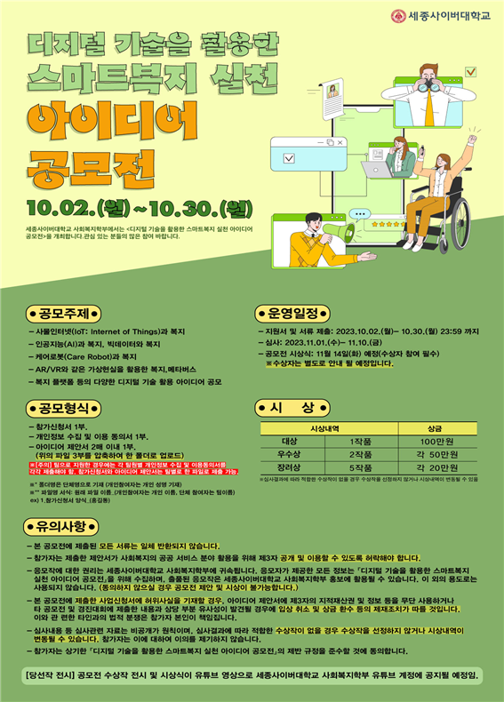 공모 기간은 10월 2일부터 30일까지며, 참가신청서 1부, 개인정보수집 및 이용동의서 1부, 아이디어제안서 2매 이내 1부를 제출하면 된다. 공모전 관련 서류양식 및 자세한 안내사항은 사회복지학부 홈페이지에 있는 학부 행사 공지사항에 공지되어 있다.