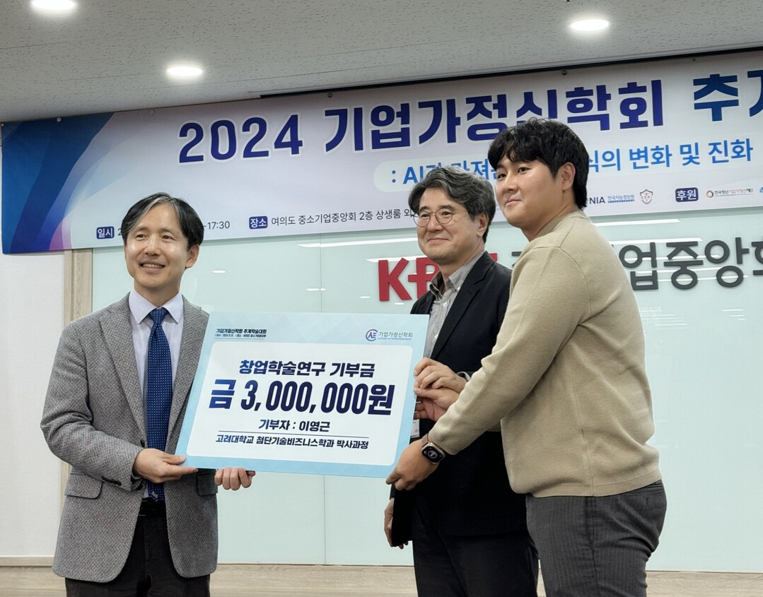 사단법인 기업가정신학회(제 5대 회장 김태성)는 지난 15일, 여의도 중소기업중앙회에서 열린 ‘2024 기업가정신 추계학술대회’에서 고려대학교 일반대학원 첨단기술비즈니스학과(주임교수 박재홍) 박사과정(3기) 이영근 대학원생(지도교수 손영우)이 창업학술연구를 위하여 300만원을 기부하여 기부금 전달식을 개최하였다고 전했다.