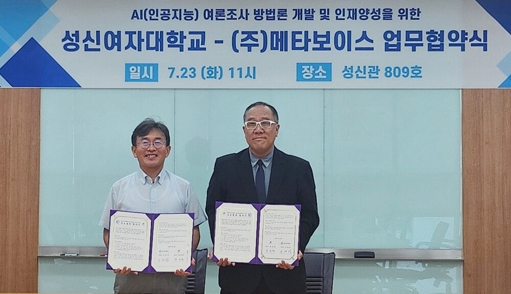 이날 협약식에는 성신여대 이성건 대학원장과 메타보이스(주) 박건영 대표를 비롯한 양 기관의 주요 관계자들이 참석했다. 양 기관은 이번 협약으로 ▲AI 여론조사 연구 및 인력 양성 ▲AI 여론조사 분야 인력교류 촉진, 학술 및 정보 교환 ▲AI 여론조사 기술, 서비스, 데이터 분야 시설(장비) 이용▲ 양 기관의 직원 및 학생들의 현장 실습 및 교육 ▲ 기타 상호 발전에 필요한 제반 논의 등을 추진할 계획이다.