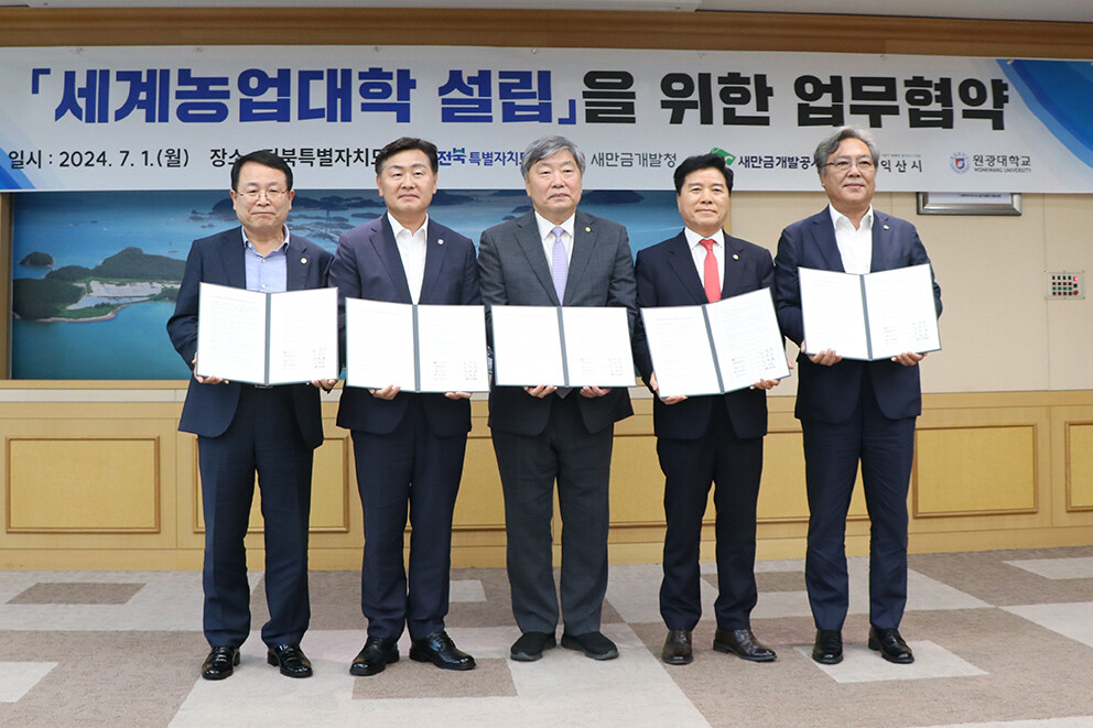 [대학저널 이선용 기자] 원광대학교와 새만금개발청, 전북특별자치도, 익산시, 새만금개발공사가 글로컬대학30 연계 세계농업대학 추진을 위한 업무협약을 체결했다.