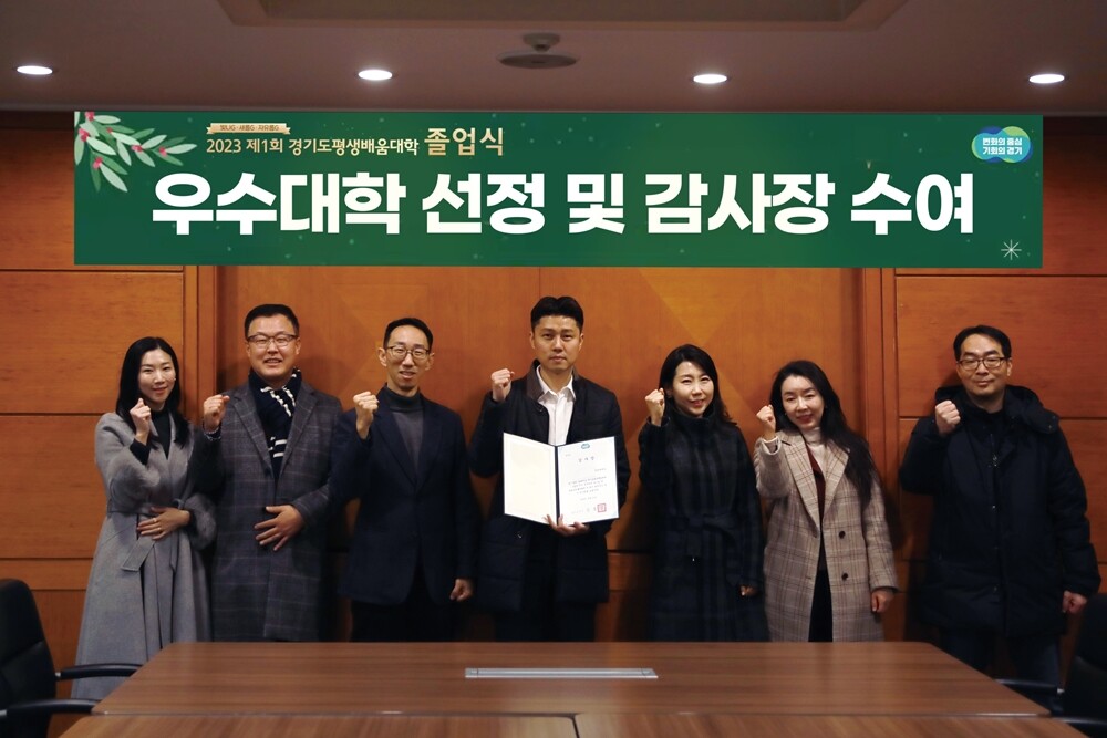 [대학저널 온종림 기자] 유한대학교가 2023학년도에 진행한 평생배움대학 GCC 사업이 우수평가기관 심의에 따라 자유롭G 부분 우수대학으로 선정됐다. 경기도는 총 14개 GCC 참여기관을 평가한 결과 우수평가기관 4개 기관을 선정했고, 유한대는 선정 결과에 따라 지난 12월 21일 라마다 수원 프라자홀에서 경기도로부터 감사장을 받았다.