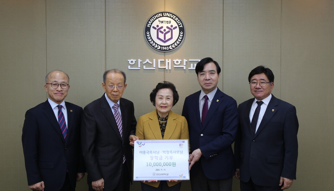 [대학저널 이선용 기자] 한신대학교는 지난 11월 11일 오후 1시 30분 경기캠퍼스 장공관 총장실에서 이용국 목사(신학과 65학번)의 장학금 전달식을 가졌다고 20일 밝혔다. 이용국 목사와 박창옥 사모는 모교인 한신대에 지난 2018년부터 매년 1천만 원씩 일곱 번째 장학금을 기부하고 있다.